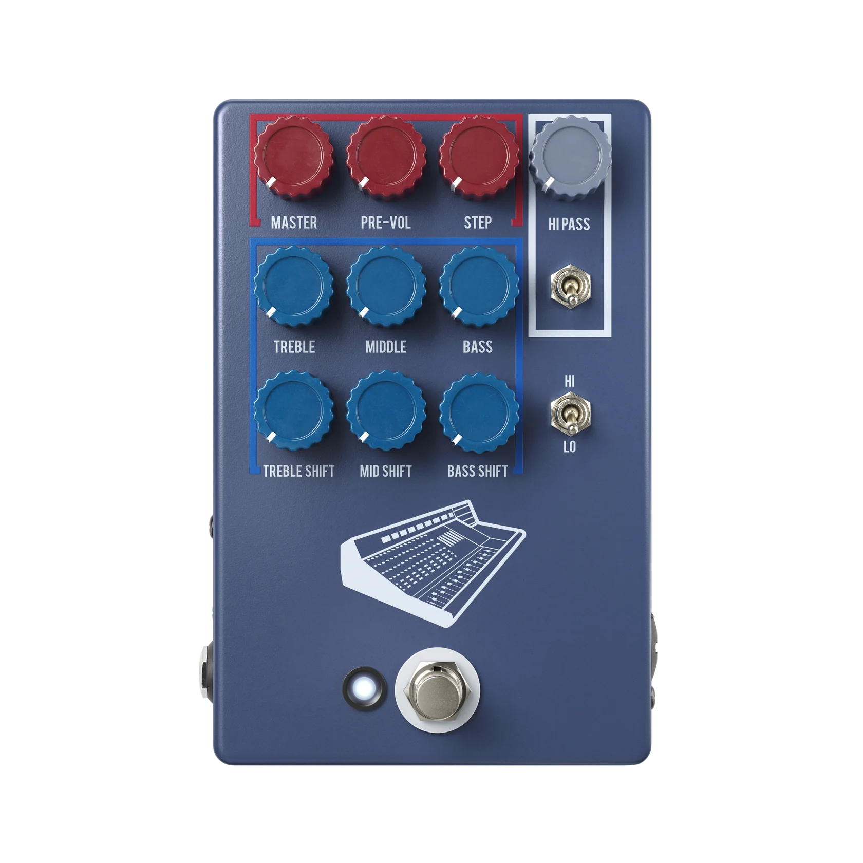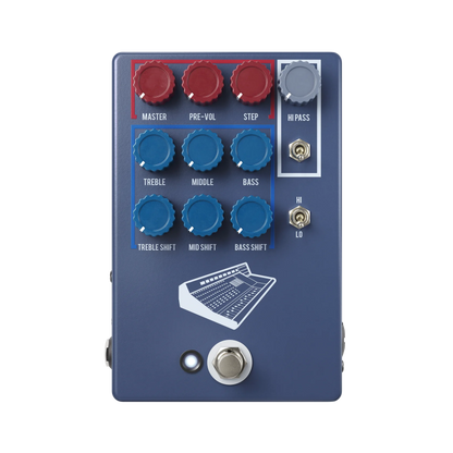 The Gain section in red has three controls: Master, Pre-Vol, and Step. The Master volume controls the overall volume of the unit. The Pre-Vol controls the amount of gain between the two internal gain stages. This acts as a "drive" or "gain" control, adding more grit, distortion, and even fuzz as you increase the gain.