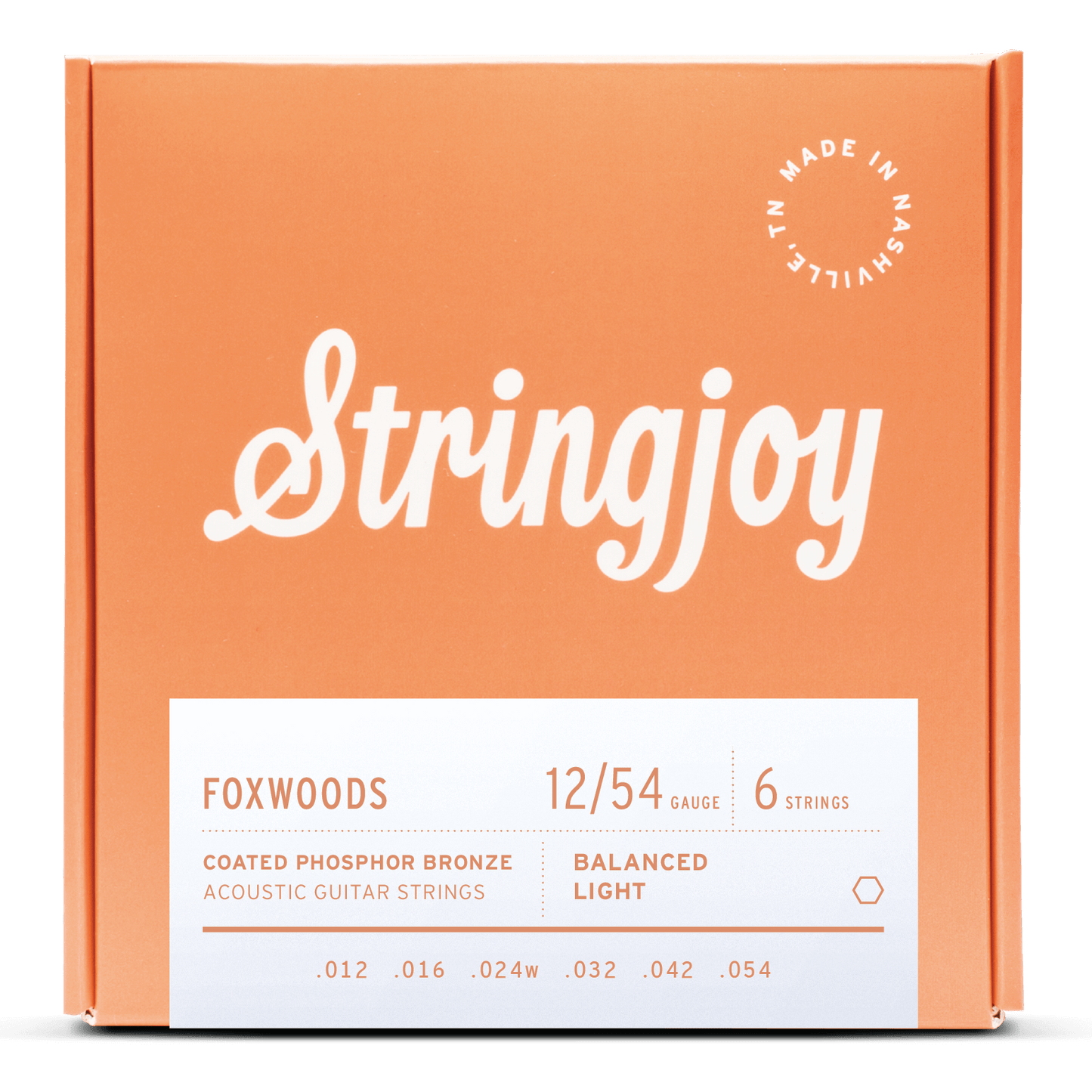 Stringjoy Foxwoods acoustic guitar strings are made by a small team in Nashville, TN, USA, out of all-American materials: our top-quality enamel-coated Phosphor Bronze alloy, wound around a high carbon hexagonal steel core wire.