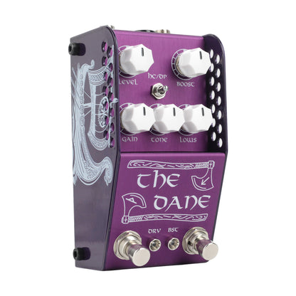OVERVIEW: THE DANE is a creation designed to meet the exacting needs of Danish Pete, However due to the design brief needing to cover the wide palette of sounds he uses, the pedal finished up being the most versatile pedal available on the market for such a clean design. THE DANE has two sides; a complex light to medium gain overdrive on the left and a high headroom super clean boost on the right. The pedal is designed so that the boost runs into the drive side. This yields three distinct tonal variations ranging from clean boost all the way through to full and fat saturation. The pedal is also designed to clean up impeccably from your volume control and as such it is ideal for dynamic players who like to adjust their playing style.