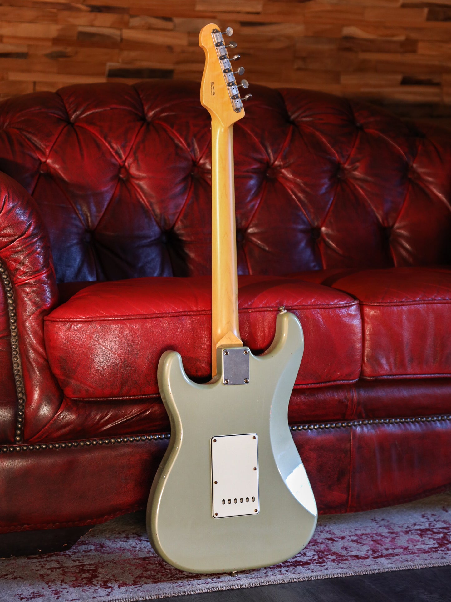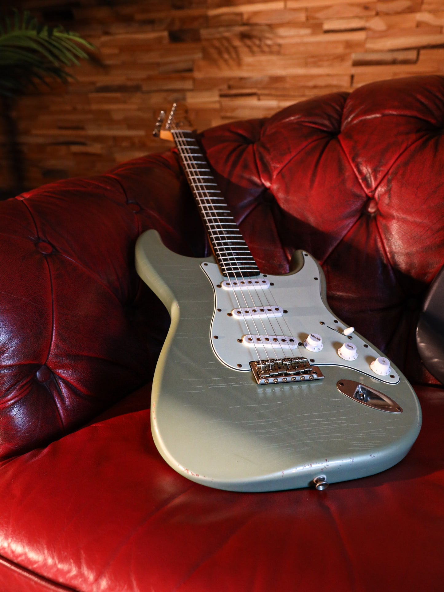 The Woodstock Old-Boy S electric guitar in sage green was handcrafted in the Ukraine.